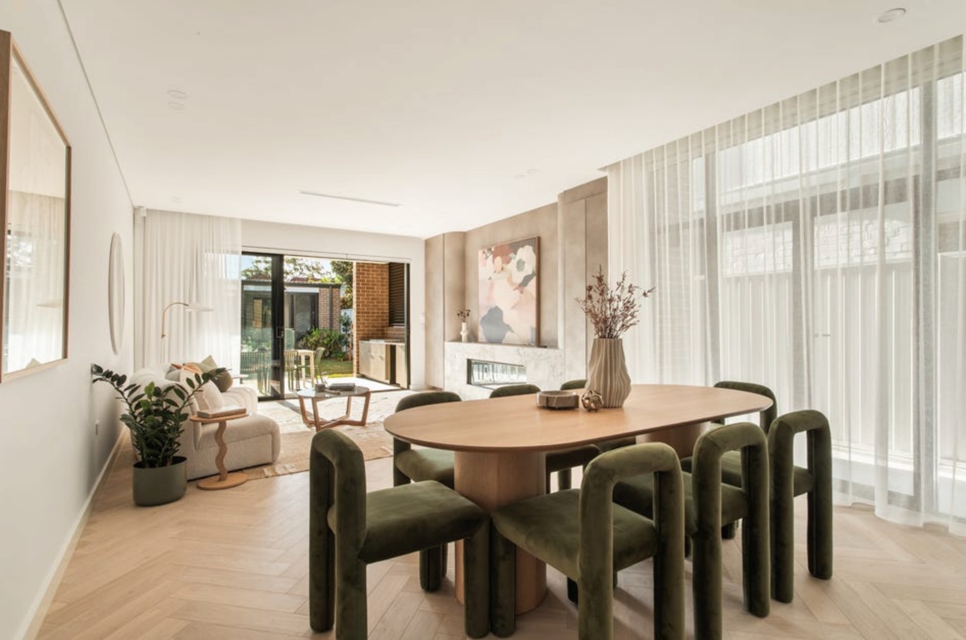 -Expansive open plan living featuring a custom gas fireplace