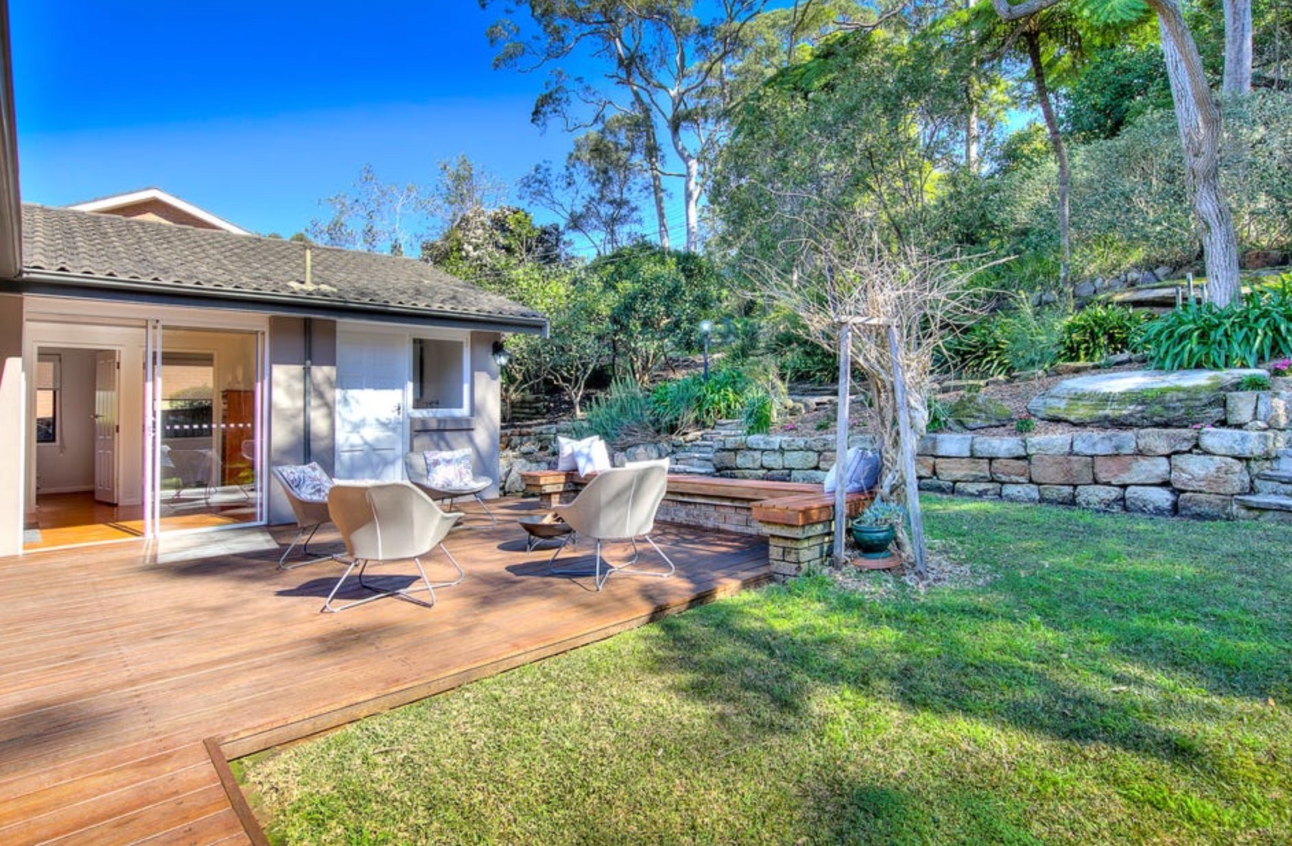 -Cascading rear gardens are easy care and create a tropical feel
