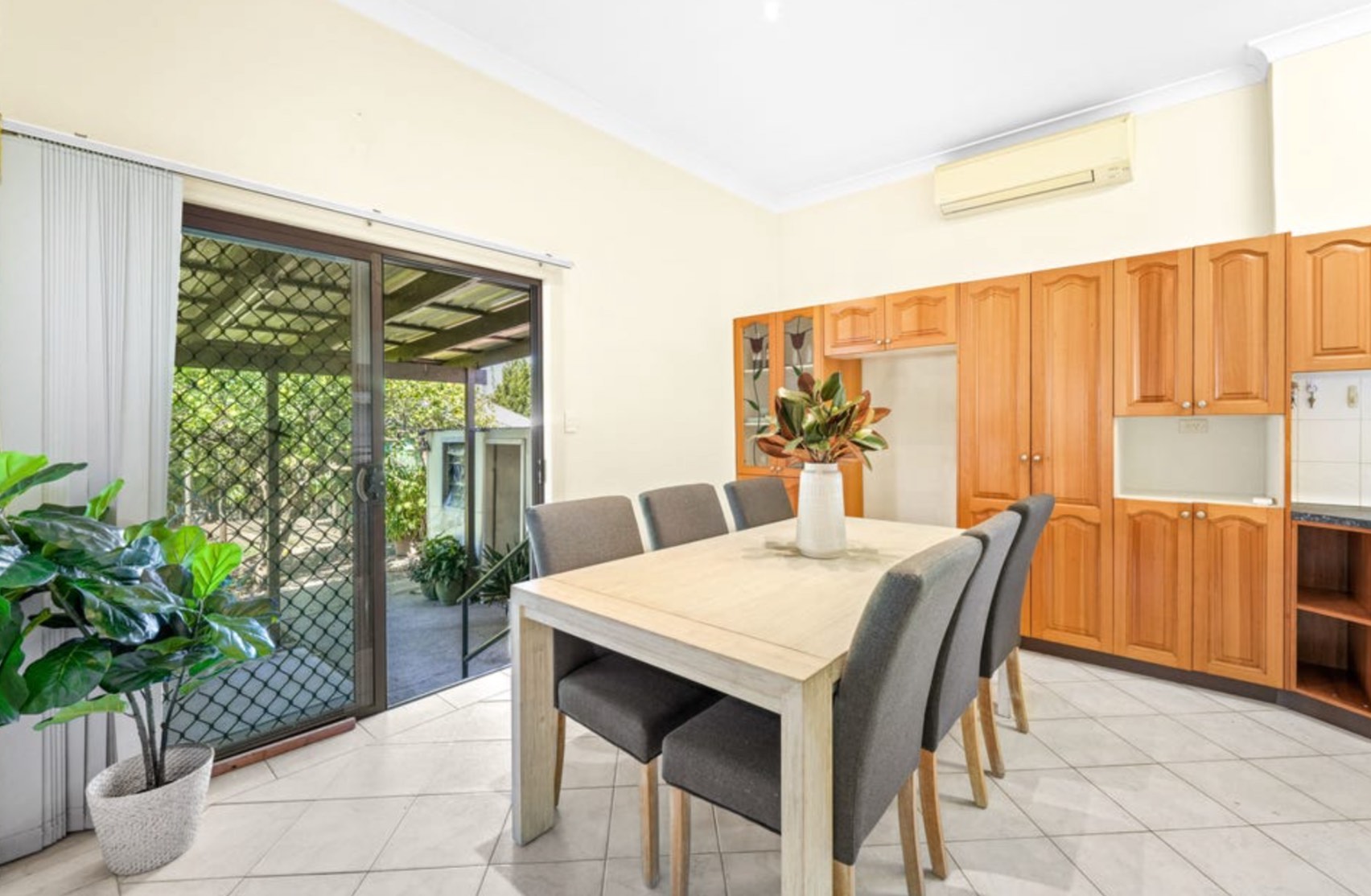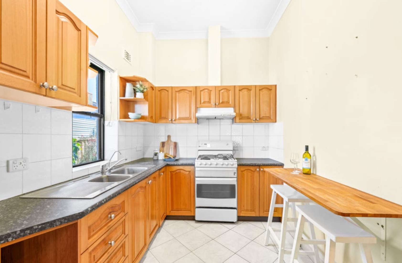 - Sizeable kitchen has gas cooking and ample timber cabinetry