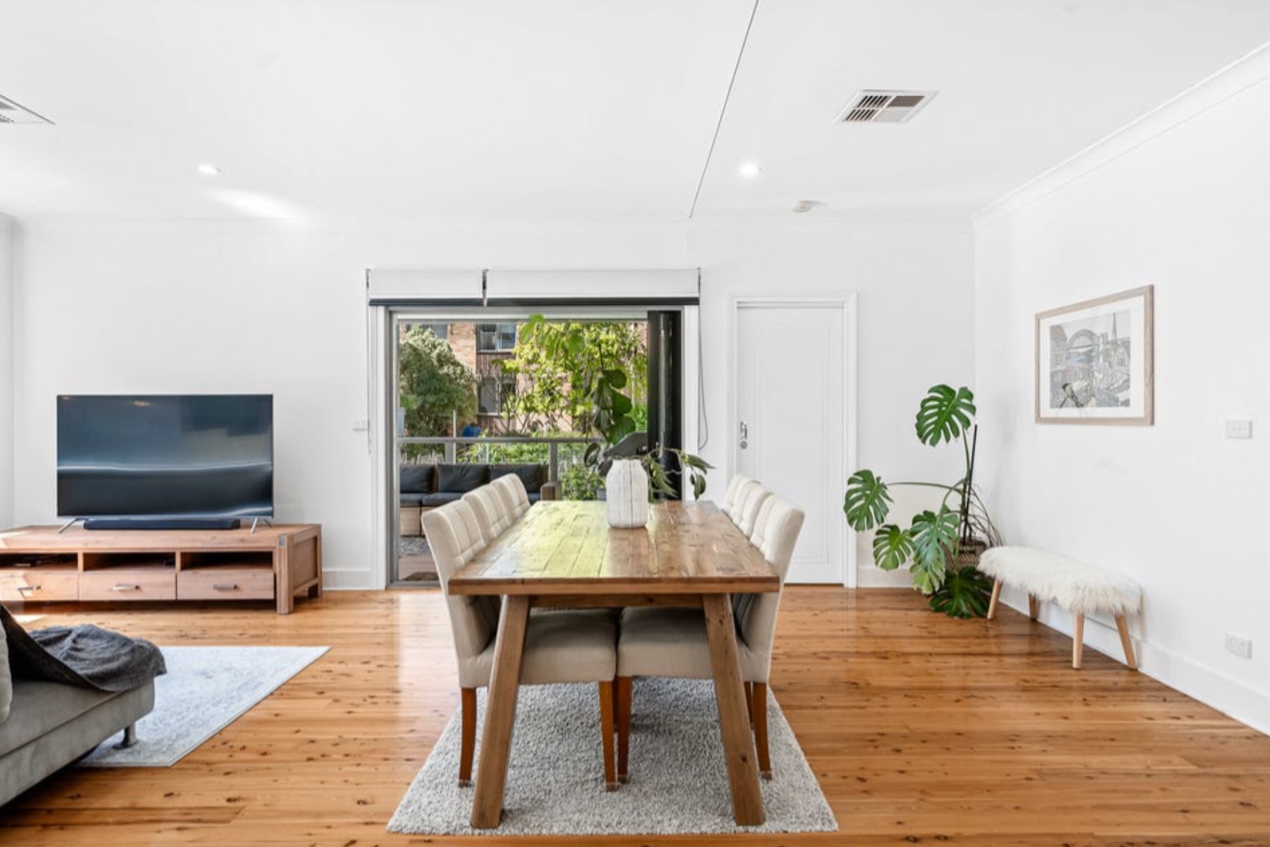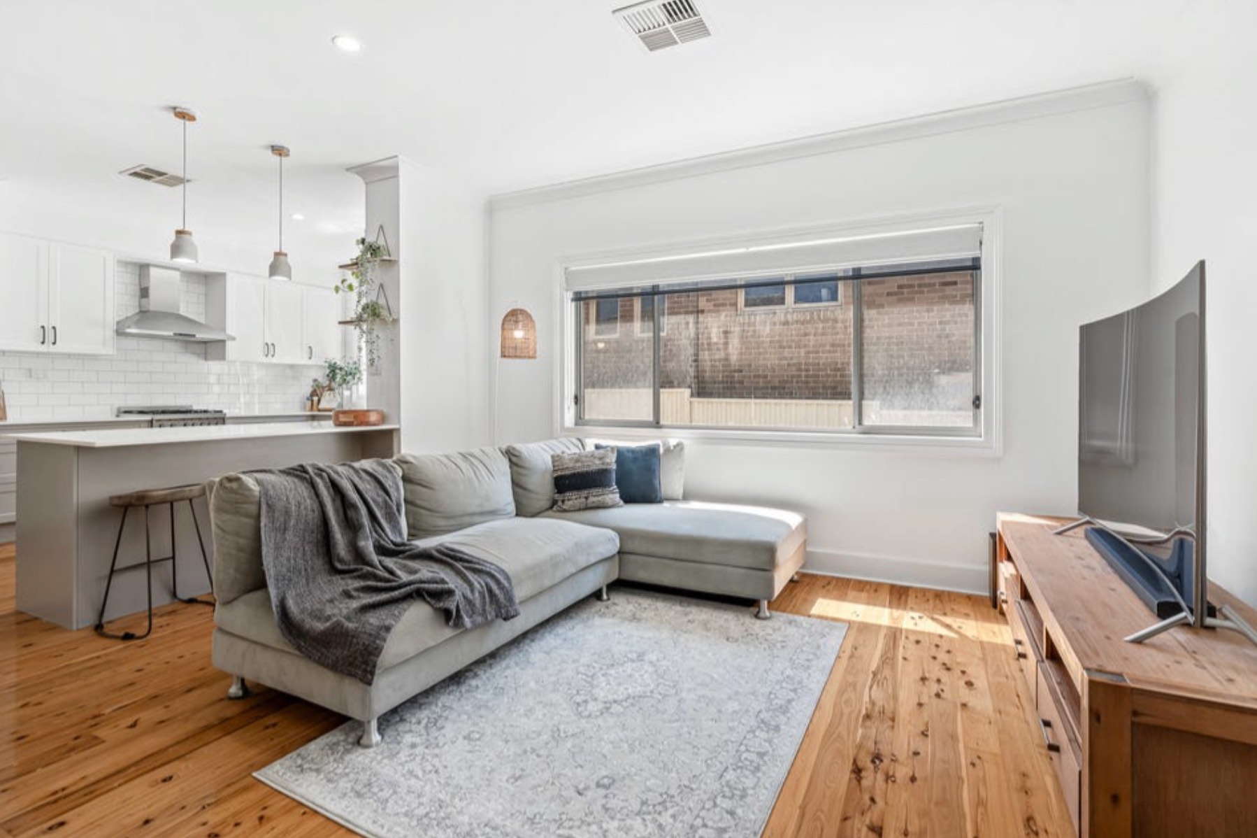 - Expansive open-plan living area, floorboards throughout