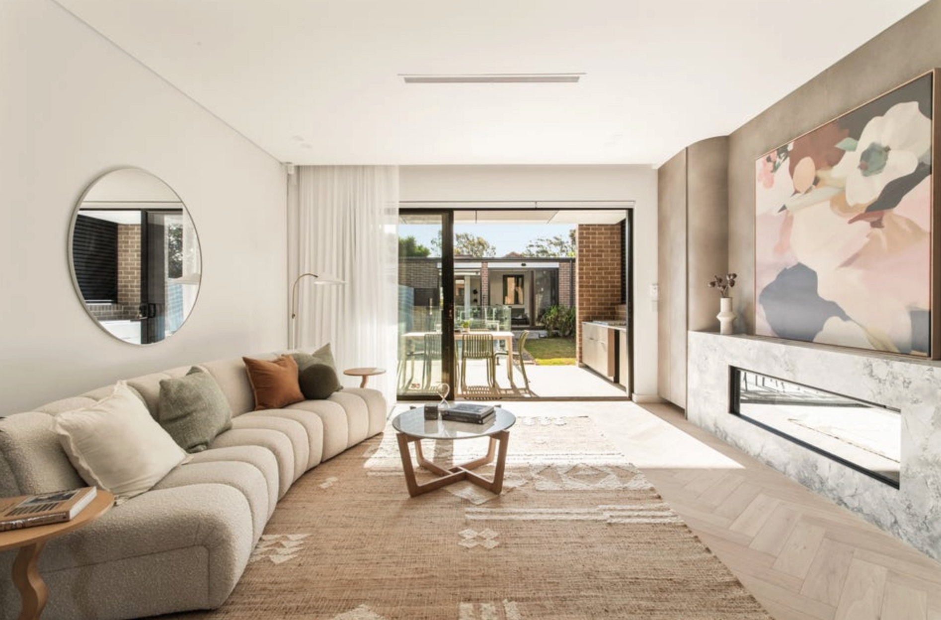 -Expansive open plan living featuring a custom gas fireplace