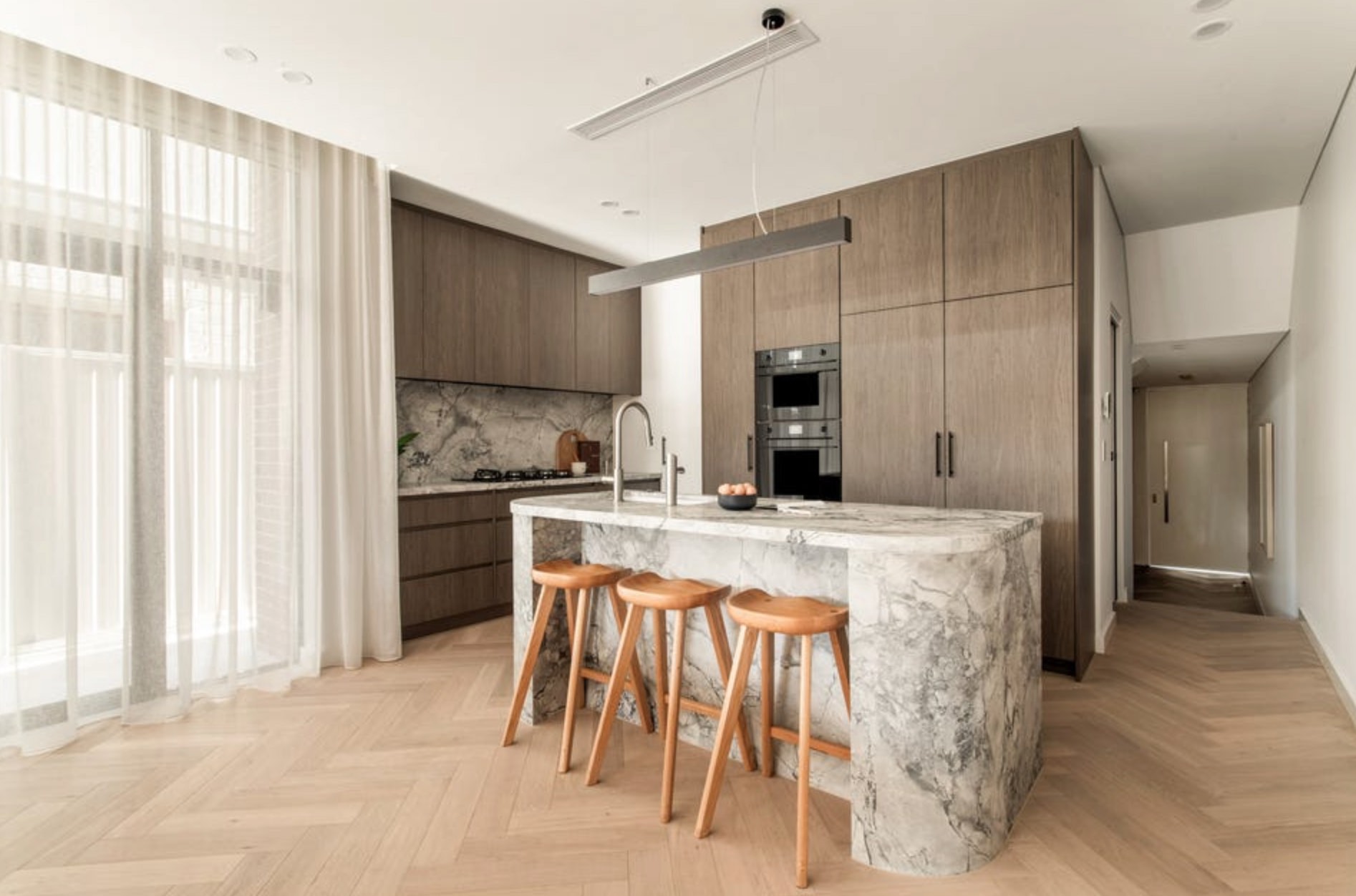 -Herringbone oak floors, soaring ceilings, streamlined storage